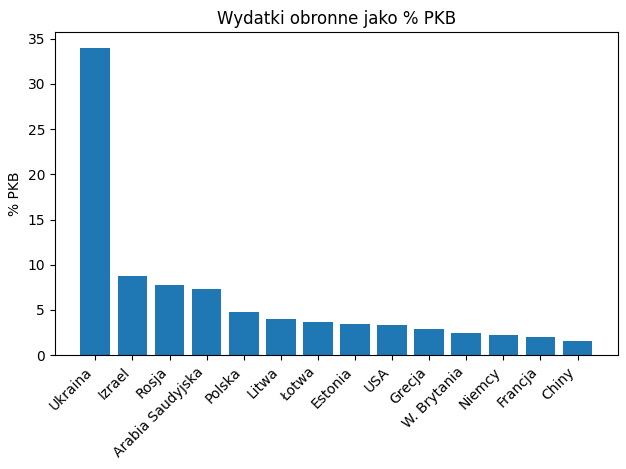 Na pierwszym miejscu pod względem udziału w PKB zdecydowanie znajduje się Ukraina, która przeznacza na obronność około jednej trzeciej całej gospodarki – co jest bezpośrednim skutkiem trwającej wojny. Wysokie wskaźniki notują również państwa permanentnie narażone na konflikty lub napięcia regionalne, takie jak Izrael, Rosja czy Arabia Saudyjska.