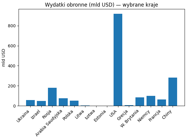 Kraj | Udział w PKB (%) | Wydatki (mld USD) | Uwagi |